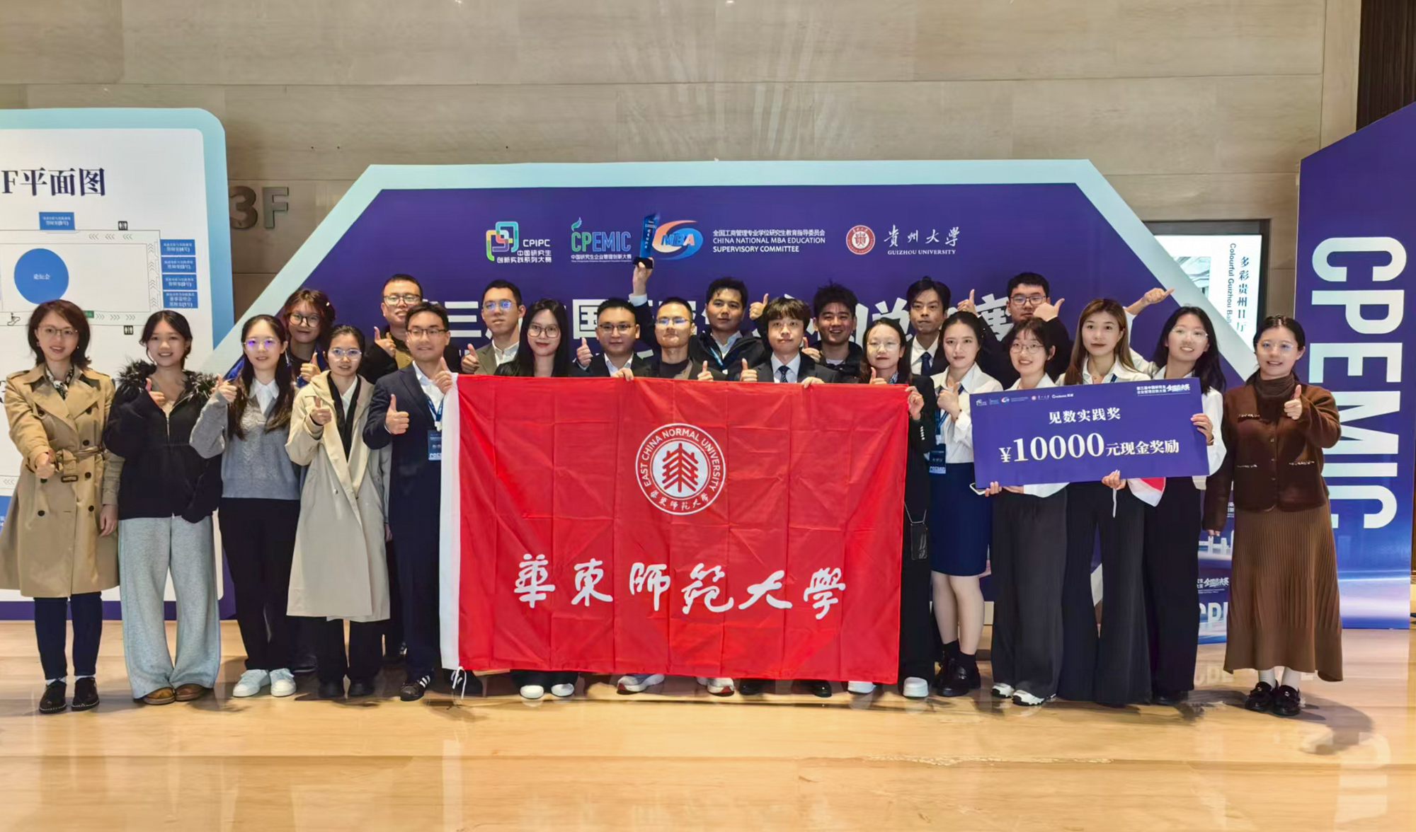 华东师大“天际风能”(右6)、“谢谢你算我们队”(右7)、“蓝花楹”(右10)获全国一等奖(企业决策赛道)