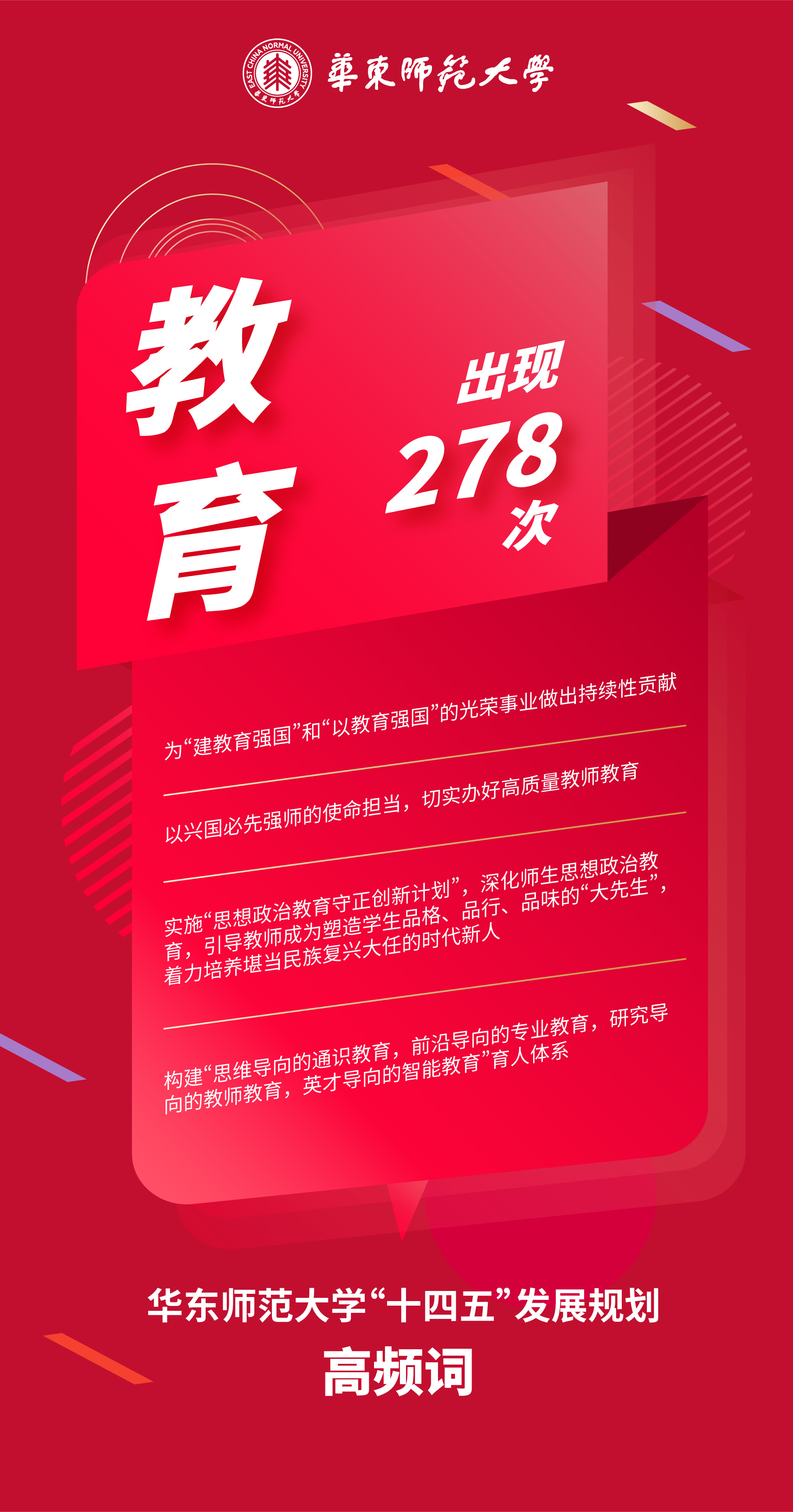 华东师范大学将坚守为党育人、为国育才使命,锚定立德树人根本任务,进一步坚定建好中国特色世界一流大学的信心决心,着力营造追求卓越的创新文化,追求实现更高质量的卓越(Excellence)发展、创新(Creativity)发展、引领(Navigation)发展、特色(Uniqueness)发展,矢志为“建教育强国”和“以教育强国”的光荣事业做出持续性贡献,为中华民族伟大复兴和人类文明进步做出历史性贡献!