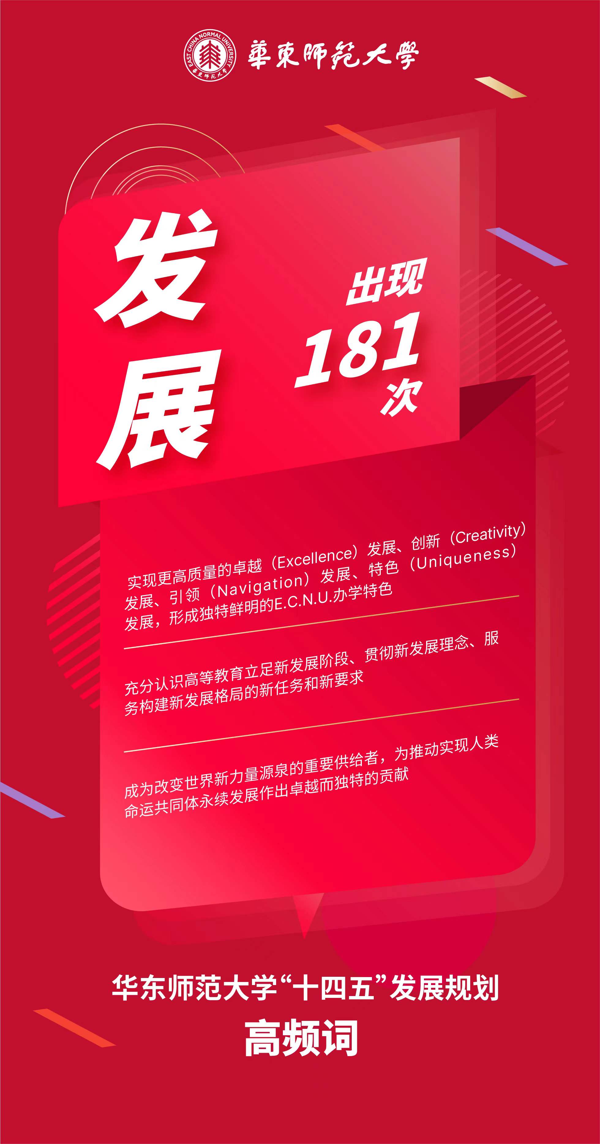 实现更高质量的卓越(Excellence)发展、创新(Creativity)发展、引领(Navigation)发展、特色(Uniqueness)发展,形成独特鲜明的E.C.N.U.办学特色