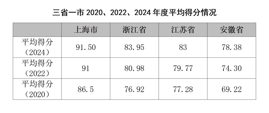 上海律典智库主任程彬表示,《蓝皮书》对三省一市的城市进行分类统计,上海得分最高,为91.5分;浙江省与江苏省平均分较为接近,相差仅在1分左右。与上次测评相比,三省一市的平均分值均得到提高,其中江苏省和安徽省进步明显,江苏省评级由B+升到A-,安徽省评级由B升到B+。